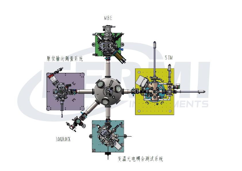 费勉仪器为超高真空复杂系统的样品传递专门设计研发了圆形传样系统,该腔体采用超高真空兼容材料SS316,形似UFO,侧面连接口可以对接不同的子系统,使样品可以在真空环境下来回自由切换并进行原位测量。